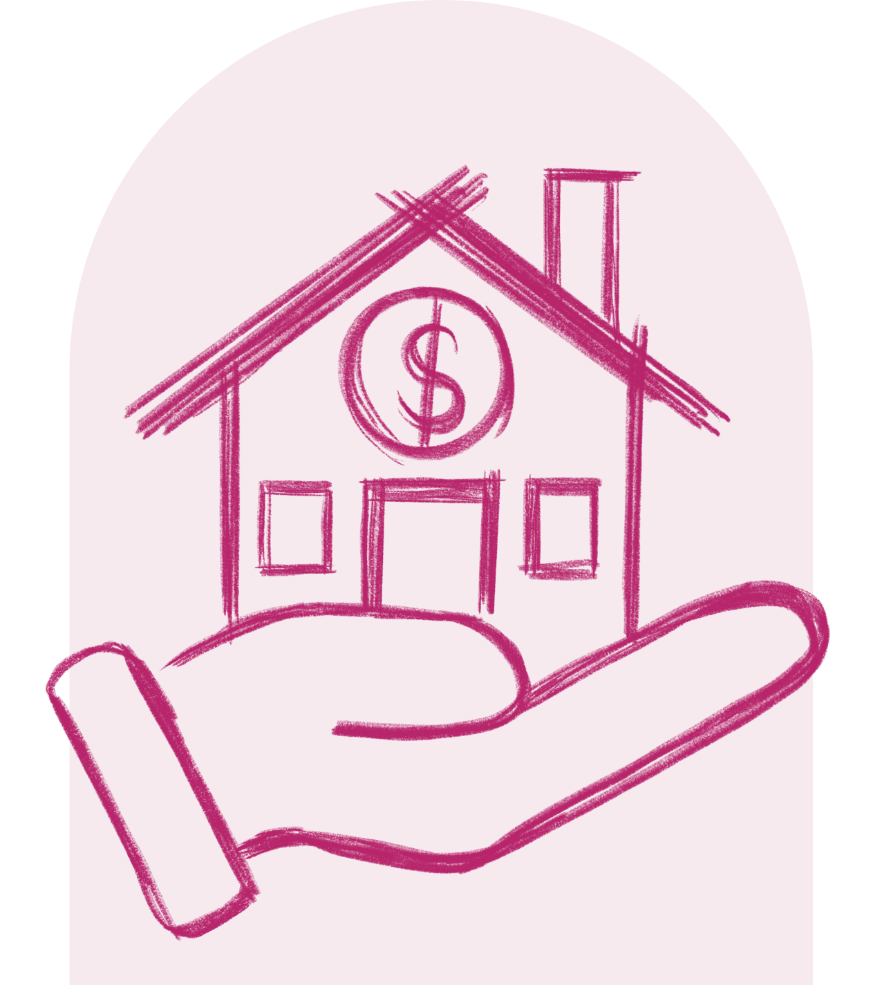 Pink sketch of a house with a dollar sign inside, being held in an open hand.